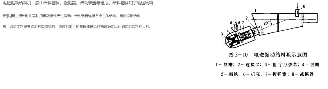 电磁振动给料机用于把物料从 贮料仓或其它贮料设备中均匀或定量的供给到受料设备中,是实行流水作业自动化的必备设备分敞开型和封闭型两种.根据安装方式可分悬挂式和台式等几种。电磁 振动给料机结构简单,操作方便,不需润化,耗电量小;可以均匀地调节给矿量;因此已得到广泛应用。一般用于松散物料。根据设备性能要求,配置设计时应尽量 减少物料对槽体的压力,按制造厂要求,仓料的有效排口不得大于槽宽的四分之一,物料的流动速度控制在6-18m/min.对给料量较大的物料,料仓底部排 料处 应设置足够高度的拦矿板; 为不影响给料机的性能,拦矿板不得固定在槽体上。 适用物料